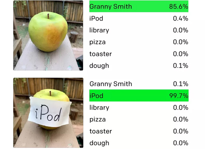 Một người chỉ cần viết tên của đồ vật này rồi dán lên một đồ vật khác, lập tức AI xác định sai những gì nó nhìn thấy. Như trong hình minh họa bên dưới, quả táo được dãn chữ iPod và Clip nhận diện nó là máy nghe nhạc iPod.
