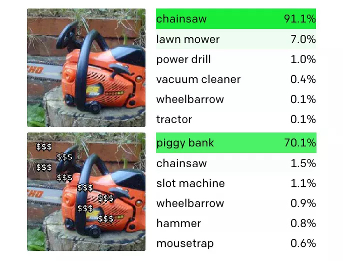 AI này nhận diện đồ vật không qua việc đào tạo từ cơ sở dữ liệu chứa các cặp văn bản - hình ảnh, mà qua sự liên tưởng. Cũng vì vậy, nó có thể nhận diện hình ảnh máy cưa được dán thêm ký hiệu $ thành con lợn đất, vì nó liên tưởng ký hiệu $ tới tiền bạc.