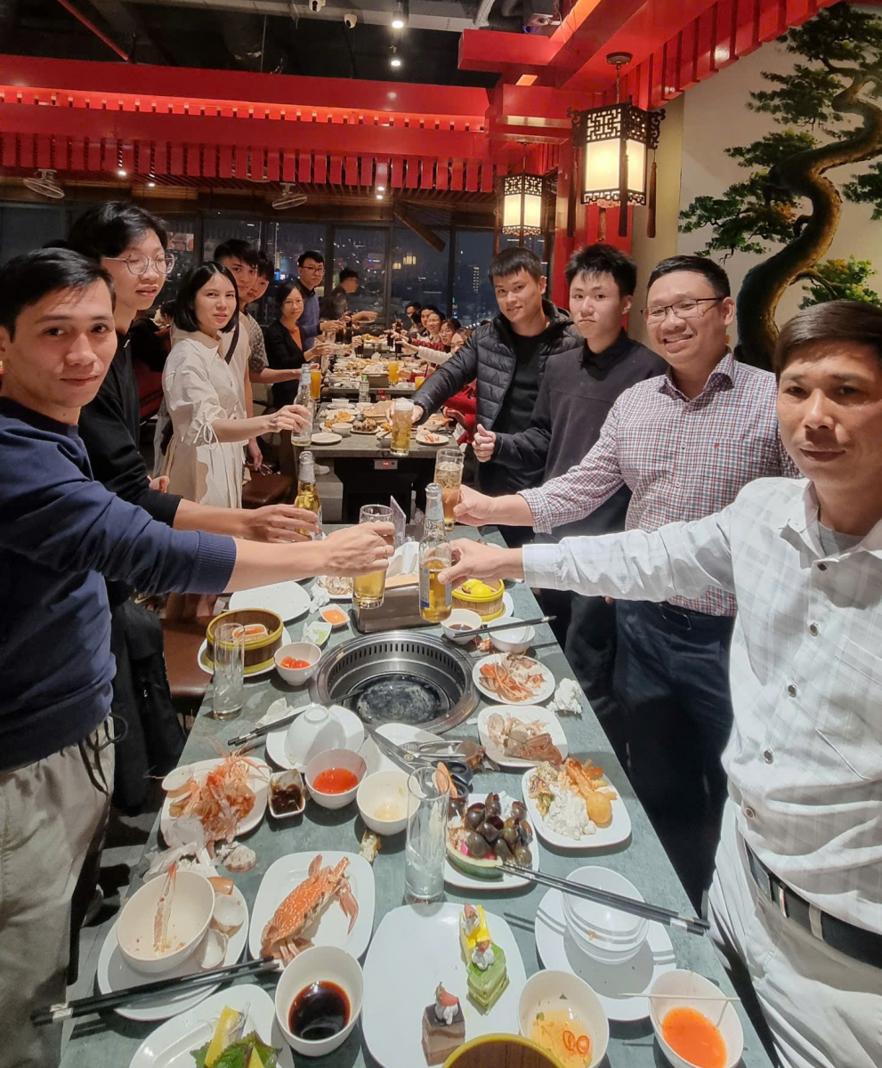 Buổi Lễ tổng kết 2024 kết thúc khép lại, cũng là lúc mọi người di chuyển tới địa điểm tất niên Buffet Hải Sản Cửu Vân Long, 302 Cầu Giấy. 18h cùng ngày, tất cả CBNV đã hội tụ để cùng nhau thưởng thức những món ăn ngon và tận hưởng không khí rộn ràng của bữa tiệc cuối năm. Anh/chị/em cùng nâng ly chúc mừng, chia sẻ những câu chuyện vui vẻ sau một năm làm việc chăm chỉ.