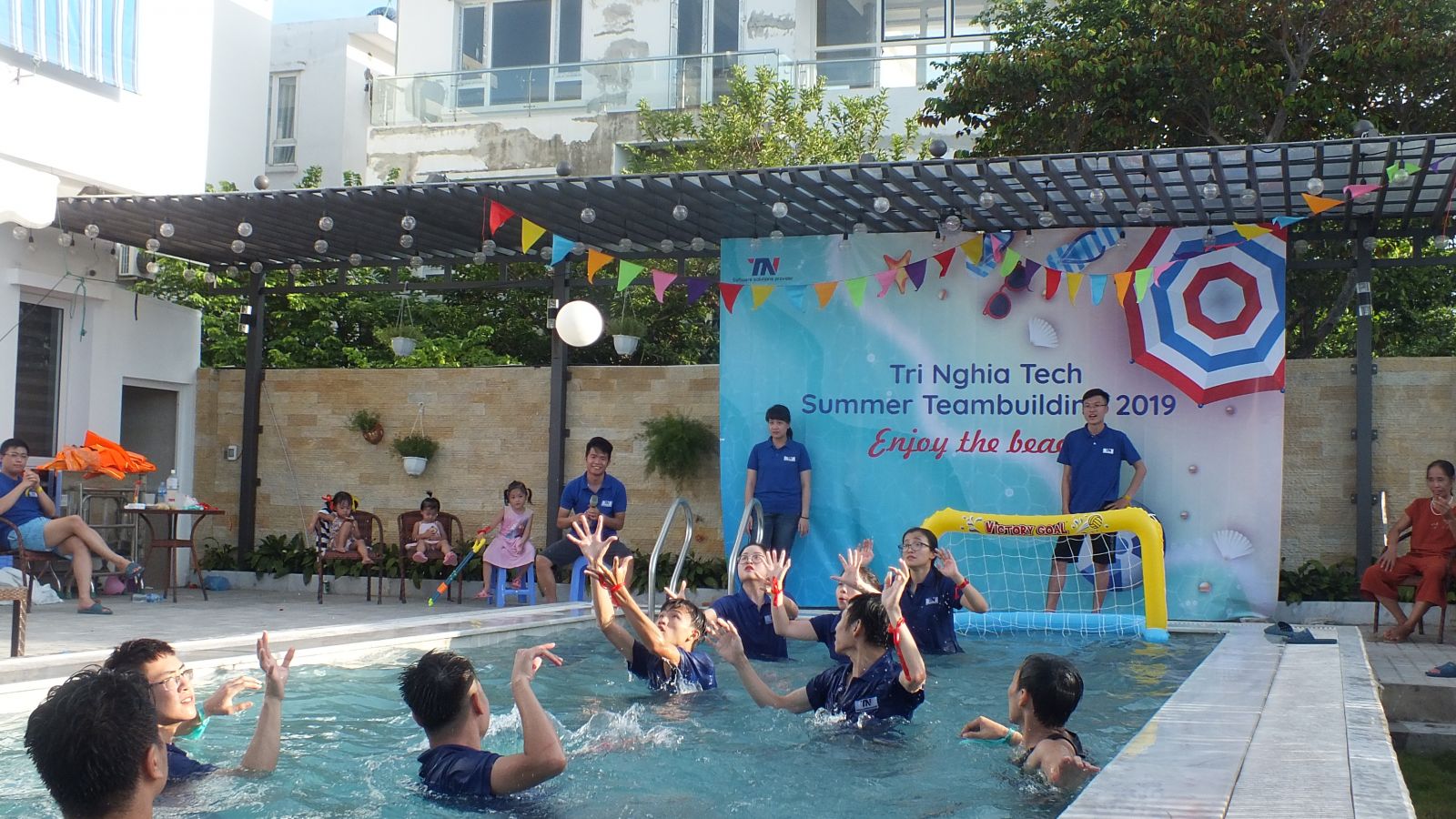 Các trò chơi vô cùng hấp dẫn được tổ chức tại bể bơi: bóng ném, chuyền bóng, xếp chữ với 03 đội Vàng, Xanh, Đỏ cạnh tranh nhau quyết liệt từng điểm số.