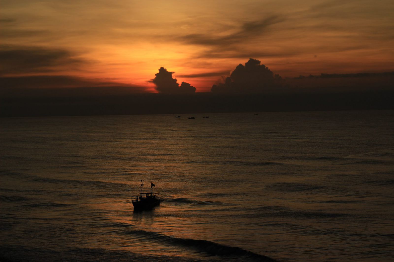Sau một đêm ra khơi đánh cá, những con thuyền trở về nhà lúc bình mình với lưới đầy cá tôm.